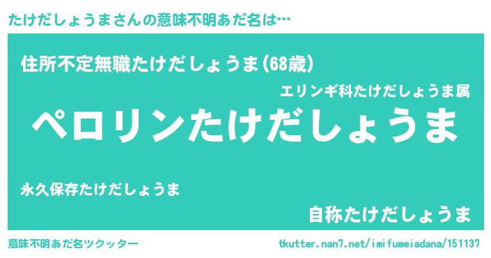 | ヘコむあだ名 | 『たけにー』『たけだしょうま(笑)』 |