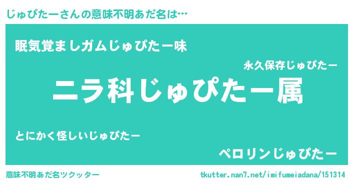 | 男性向けラノベタイトル風あだ名 | 『じゅぴたー~年齢イコール彼女いない歴の魔法使い~』 |