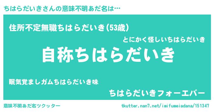 | 男性向けラノベタイトル風あだ名 | 『Re:ちはらだいきから始める異世界生活』 |