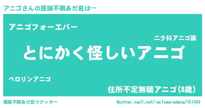 | 胡散臭い通販商品みたいなあだ名 | 『全米が絶賛したサプリメント…その名も「アニゴ」』 |