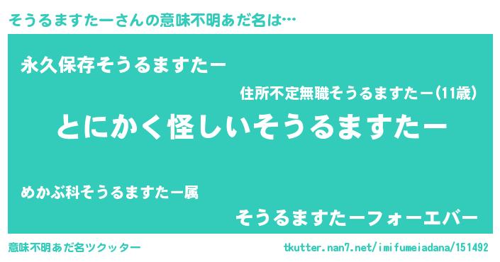 | 胡散臭い通販商品みたいなあだ名 | 『信頼と実績のサプリメント…その名も「そうるますたー」』 |