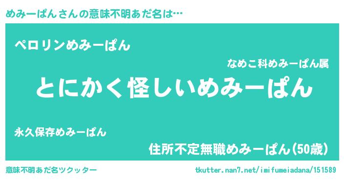 | 男性向けラノベタイトル風あだ名 | 『ダンジョンにめみーぱんを求めるのは間違っているだろうか』 |