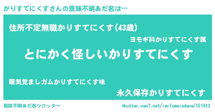 | 男性向けラノベタイトル風あだ名 | 『かりすてにくすの嫁は女の子じゃないと思った?』 |