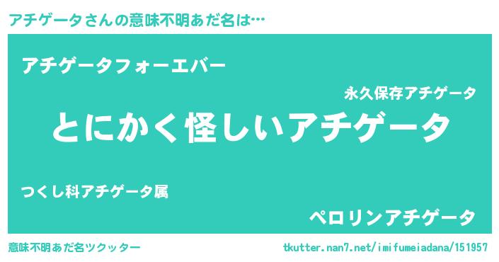 | 男性向けラノベタイトル風あだ名 | 『アチゲータの嫁は女の子じゃないと思った?』 |