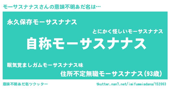 | 男性向けラノベタイトル風あだ名 | 『Re:モーサスナナスから始める異世界生活』 |
