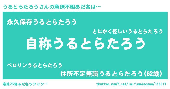 | ヘコむあだ名 | 『うるとらたろう(笑)』『うるを』 |
