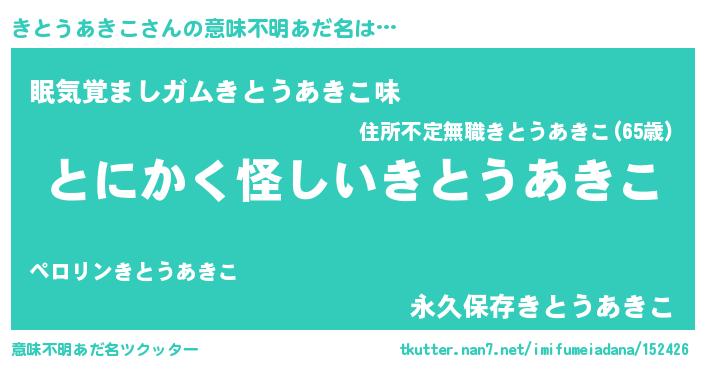 | ポケモン風あだ名 | 『ヒキトウアキコ』『キックウザ』 |