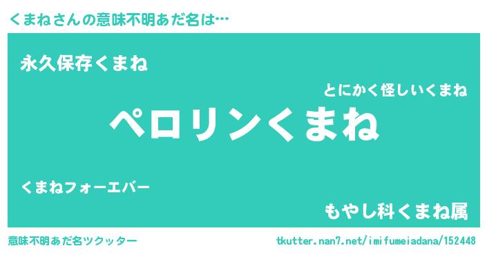 | 男性向けラノベタイトル風あだ名 | 『うちのくまねが世界を掌握している!』 |