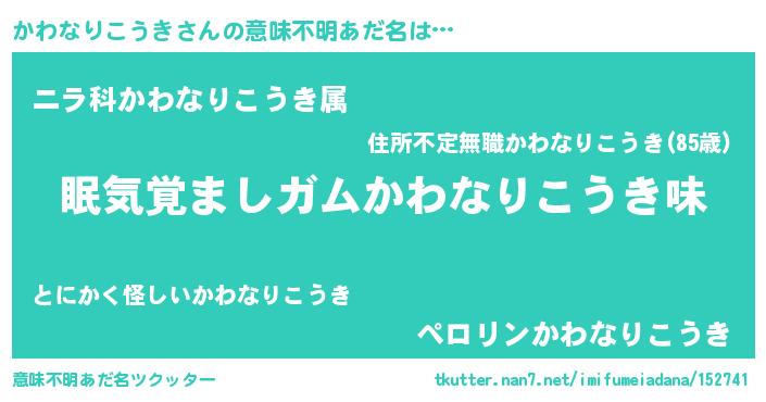 | 男性向けラノベタイトル風あだ名 | 『おまえをオタクにしてやるから、俺をかわなりこうきにしてくれ! 』 |