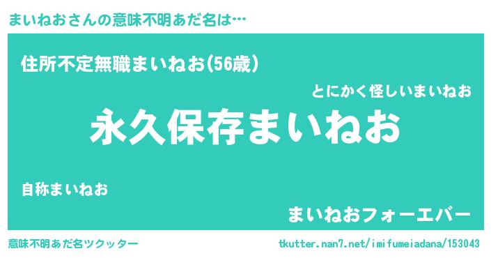 | 男性向けラノベタイトル風あだ名 | 『まいねおという概念が存在しない退屈な世界 』 |