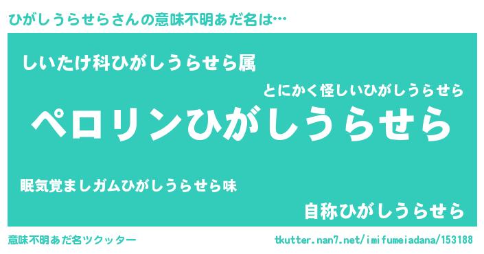 | 男性向けラノベタイトル風あだ名 | 『ヒガシウラセラアートオンライン』 |