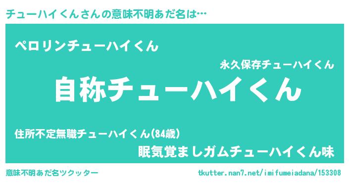 | ヘコむあだ名 | 『チュもー』『チューハイくん(小並感)』 |