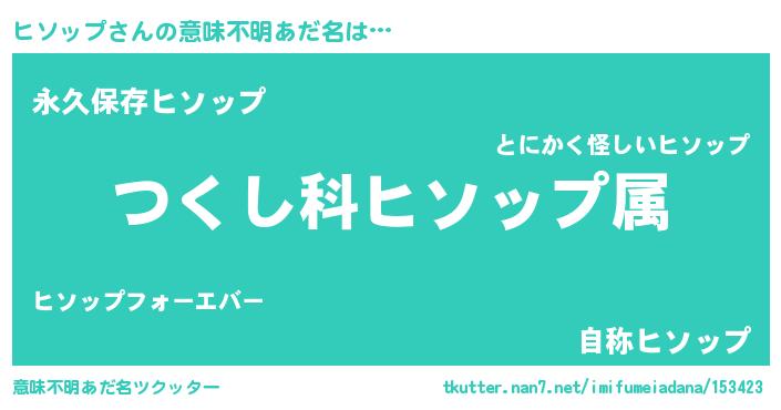 | 男性向けラノベタイトル風あだ名 | 『うちのヒソップが世界を掌握している!』 |