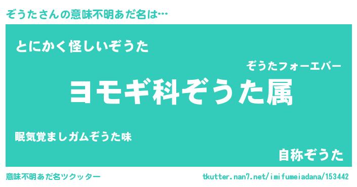 | 男性向けラノベタイトル風あだ名 | 『ぞうた~年齢イコール彼女いない歴の魔法使い~』 |