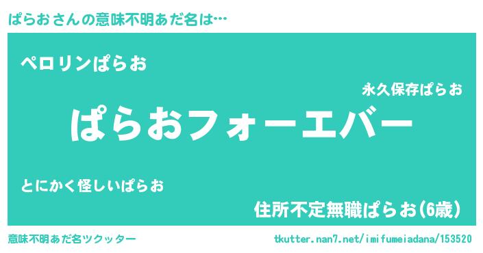| 男性向けラノベタイトル風あだ名 | 『ぱらおに滅ぼされるだけの簡単なお仕事です』 |