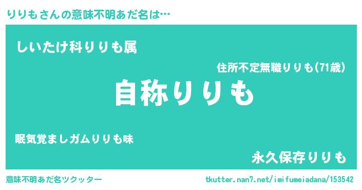 | 男性向けラノベタイトル風あだ名 | 『Re:りりもから始める異世界生活』 |