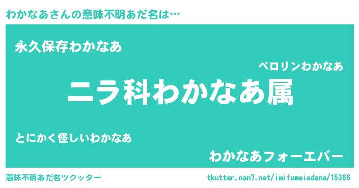 | 男性向けラノベタイトル風あだ名 | 『わかなあに滅ぼされるだけの簡単なお仕事です』 |