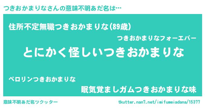 | 胡散臭い通販商品みたいなあだ名 | 『信頼と実績のペンダント…その名も「つきおかまりな」』 |