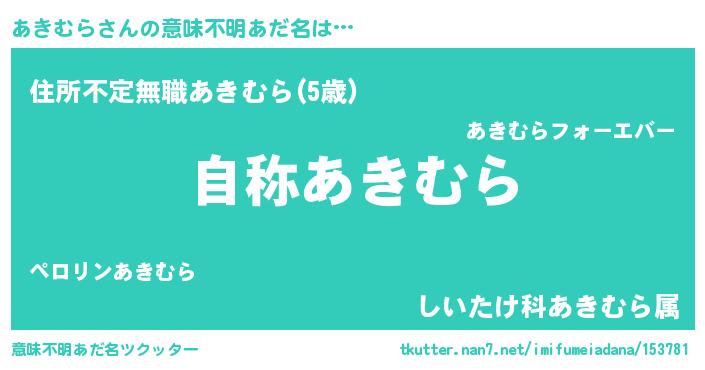 | 男性向けラノベタイトル風あだ名 | 『Re:あきむらから始める異世界生活』 |