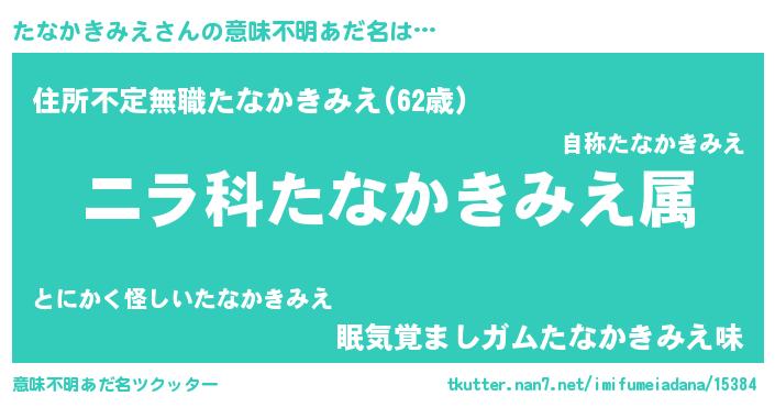 | 男性向けラノベタイトル風あだ名 | 『たなかきみえ~年齢イコール彼女いない歴の魔法使い~』 |