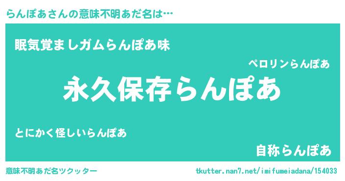 | 男性向けラノベタイトル風あだ名 | 『らんぽあという概念が存在しない退屈な世界 』 |
