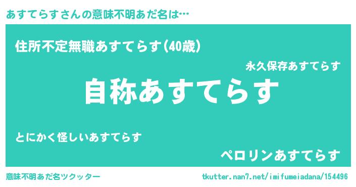 | 男性向けラノベタイトル風あだ名 | 『Re:あすてらすから始める異世界生活』 |