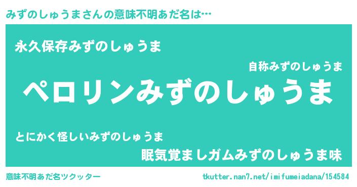 | 男性向けラノベタイトル風あだ名 | 『みずのしゅうまに滅ぼされるだけの簡単なお仕事です』 |
