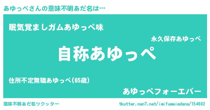 | 男性向けラノベタイトル風あだ名 | 『Re:あゆっぺから始める異世界生活』 |