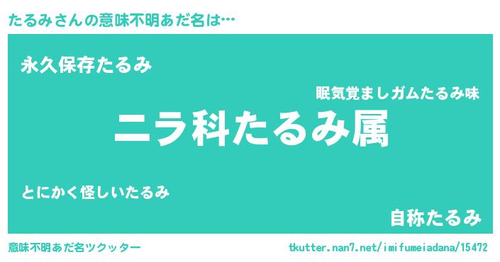 | 男性向けラノベタイトル風あだ名 | 『たるみ~年齢イコール彼女いない歴の魔法使い~』 |