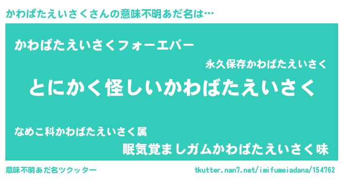 | 男性向けラノベタイトル風あだ名 | 『かわばたえいさくの嫁は女の子じゃないと思った?』 |