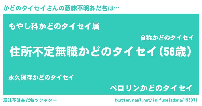 | ヘコむあだ名 | 『かどにゅー』『かどのタイセイ(爆)』 |