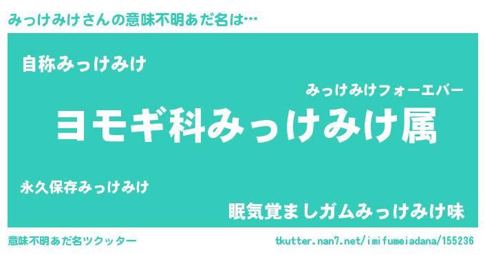 | 男性向けラノベタイトル風あだ名 | 『みっけみけ~年齢イコール彼女いない歴の魔法使い~』 |