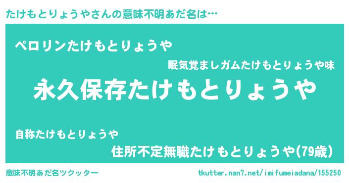 | ヘコむあだ名 | 『たけもとりょうや(笑)』『たけにゅー』 |