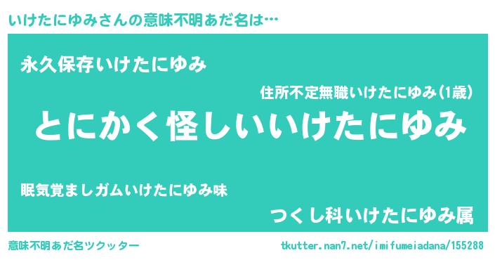 | 女子向けラノベタイトル風あだ名 | 『いけたにゆみの卵を拾いまして』 |