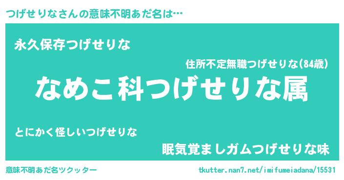 | 男性向けラノベタイトル風あだ名 | 『転生したらつげせりなだった件』 |