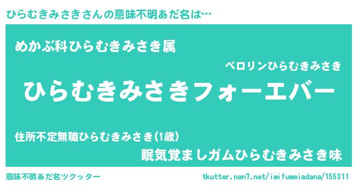 | 男性向けラノベタイトル風あだ名 | 『うちのひらむきみさきが世界を掌握している!』 |
