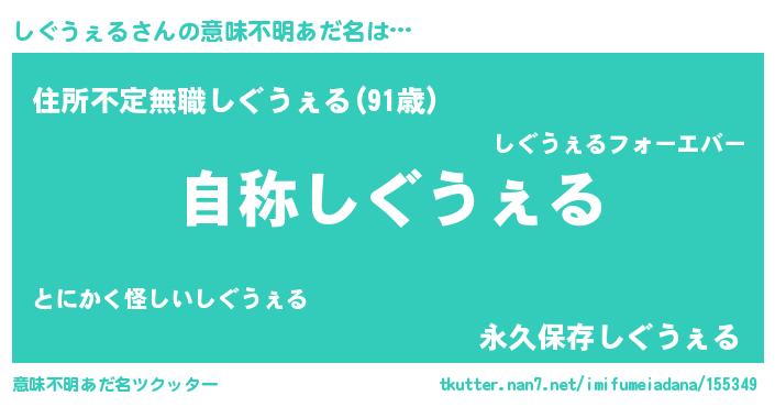 | 男性向けラノベタイトル風あだ名 | 『Re:しぐうぇるから始める異世界生活』 |