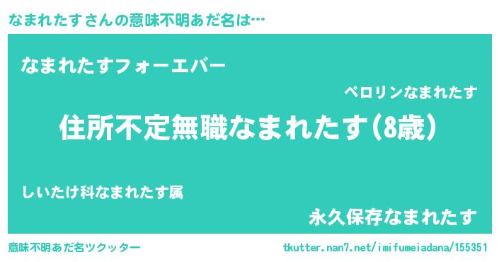 | 男性向けラノベタイトル風あだ名 | 『なまれたすに滅ぼされるだけの簡単なお仕事です』 |