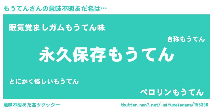 | 男性向けラノベタイトル風あだ名 | 『もうてんという概念が存在しない退屈な世界 』 |