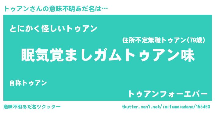 | ヒーロー風カッコイイあだ名 | 『慈愛の使者トゥアン』『幻影騎士トゥ』 |