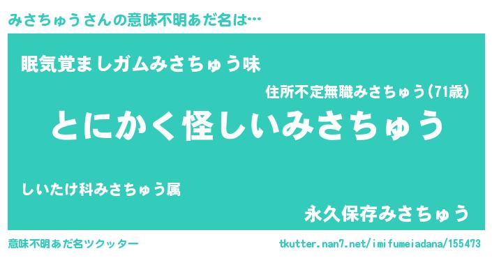 | 男性向けラノベタイトル風あだ名 | 『みさちゅうの嫁は女の子じゃないと思った?』 |