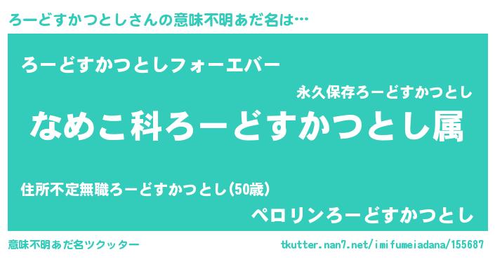 | 男性向けラノベタイトル風あだ名 | 『ろーどすかつとしに滅ぼされるだけの簡単なお仕事です』 |