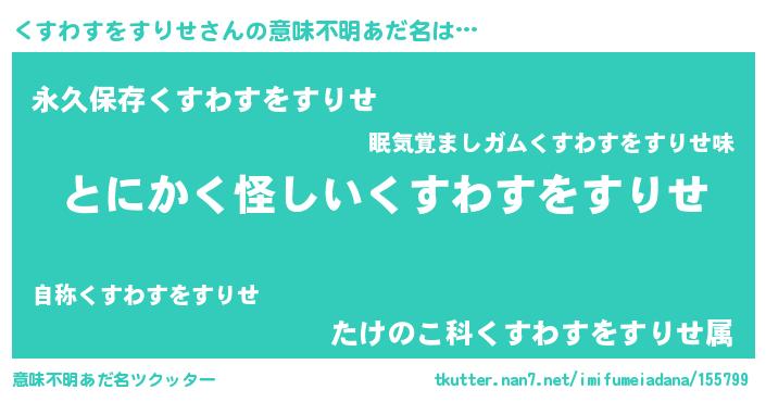 | 胡散臭い通販商品みたいなあだ名 | 『信頼と実績のサプリメント…その名も「くすわすをすりせ」』 |