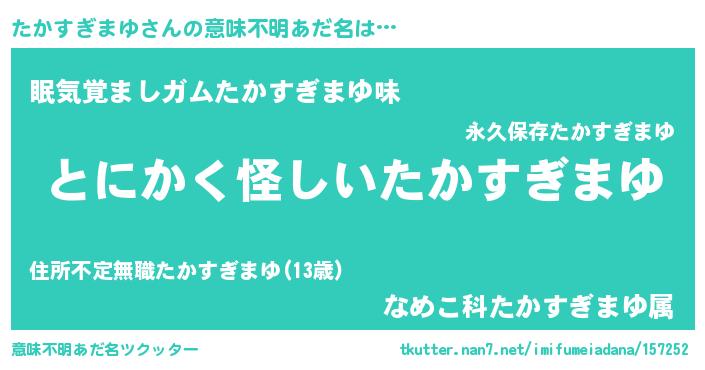| 男性向けラノベタイトル風あだ名 | 『たかすぎまゆの嫁は女の子じゃないと思った?』 |
