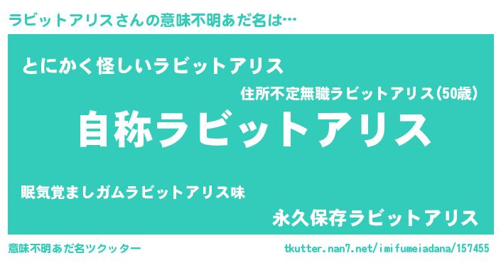 | 男性向けラノベタイトル風あだ名 | 『Re:ラビットアリスから始める異世界生活』 |
