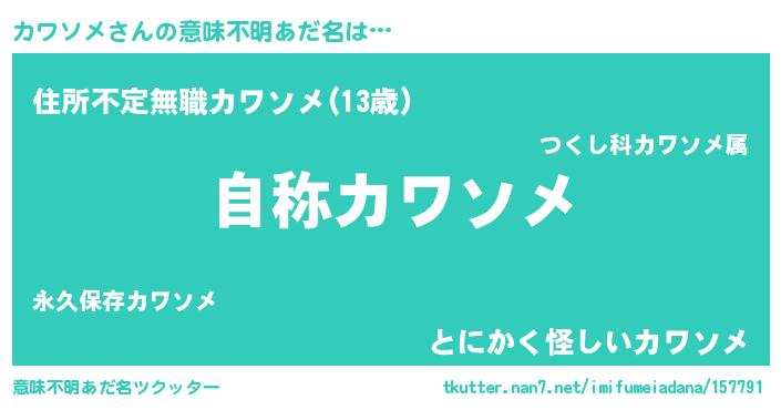 | 男性向けラノベタイトル風あだ名 | 『Re:カワソメから始める異世界生活』 |