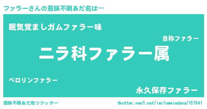 | 男性向けラノベタイトル風あだ名 | 『ファラー~年齢イコール彼女いない歴の魔法使い~』 |