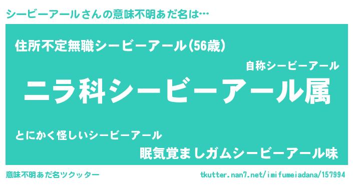 | 男性向けラノベタイトル風あだ名 | 『シービーアール~年齢イコール彼女いない歴の魔法使い~』 |