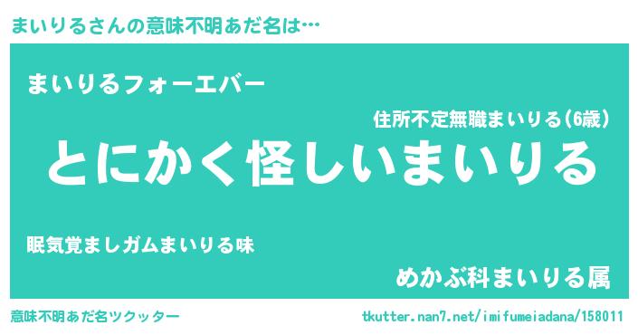 | 男性向けラノベタイトル風あだ名 | 『まいりるの嫁は女の子じゃないと思った?』 |