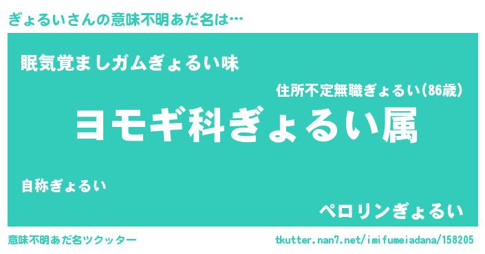 | 男性向けラノベタイトル風あだ名 | 『ぎょるい~年齢イコール彼女いない歴の魔法使い~』 |